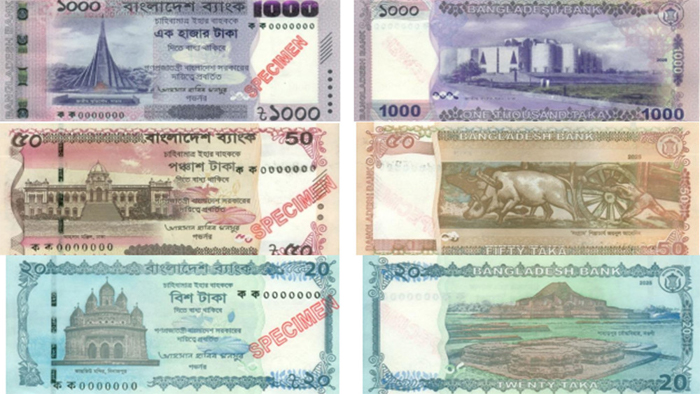 বাংলাদেশ ব্যাংকের নতুন ডিজাইনের ১০০০, ৫০ ও ২০ টাকার নোট আজ থেকে বাজারে